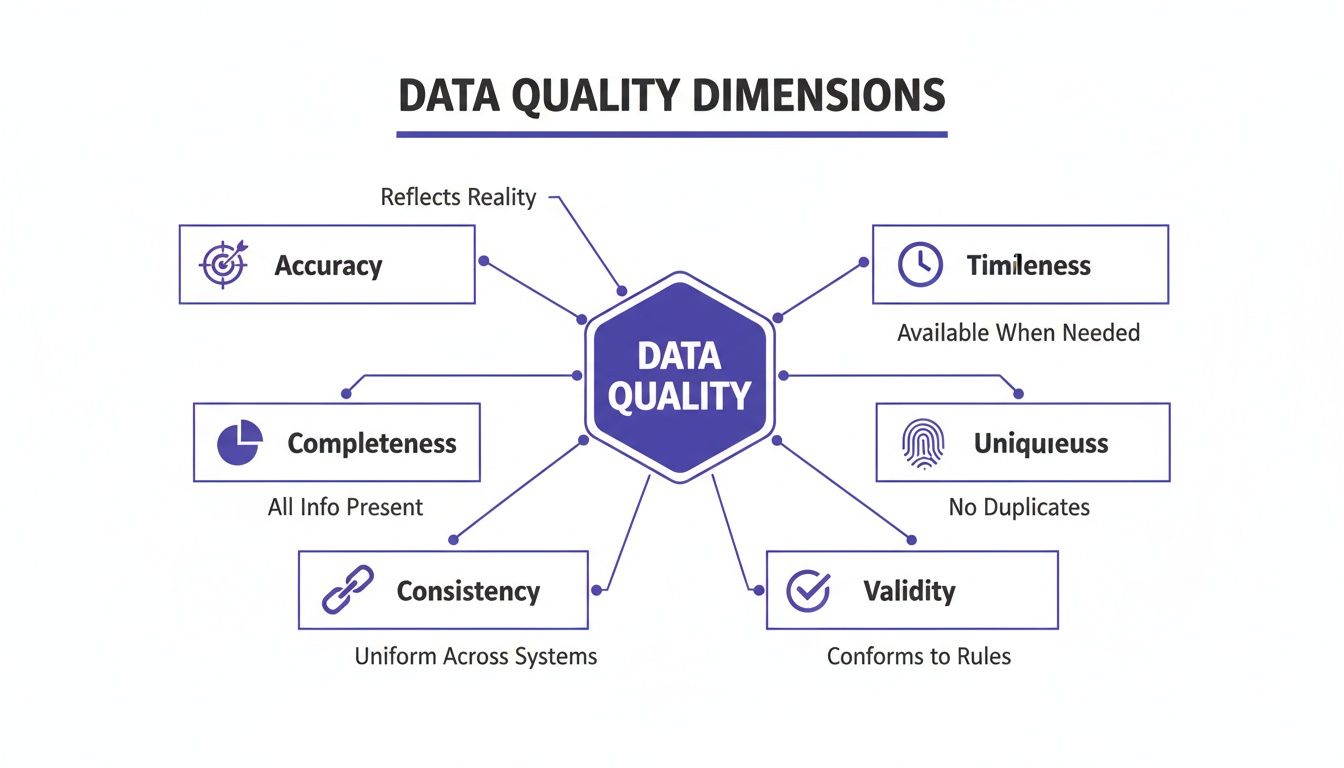 Before you can fix bad data, you need a shared vocabulary to describe what "good data" looks like. The concept can be abstract, so it is often broken down into six core, measurable dimensions. These are the fundamental building blocks of trustworthy data.