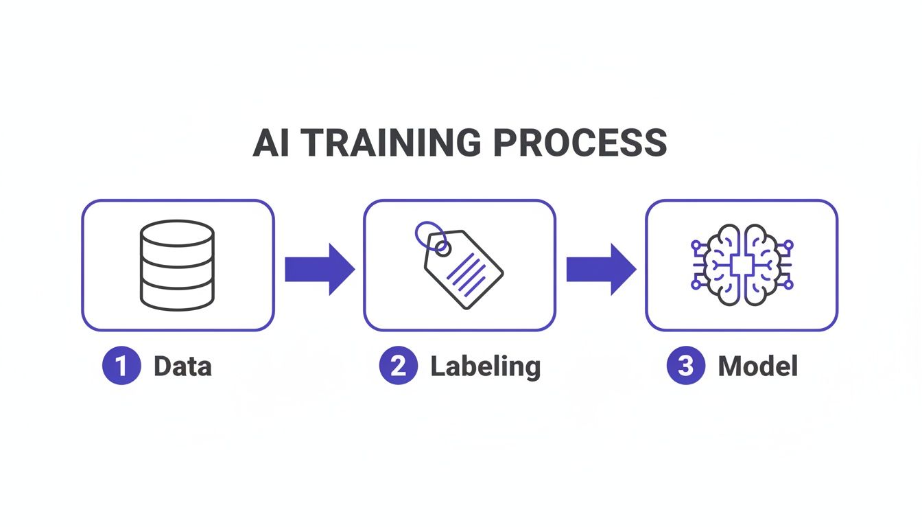 The diagram below shows this flow. It illustrates how raw data becomes fuel for a trained AI model, with the labeling stage acting as a critical filter.
