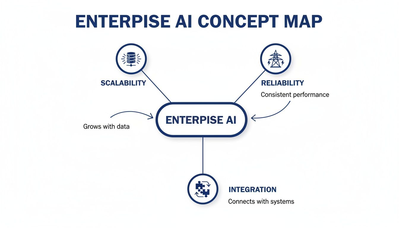 As the visual shows, enterprise AI requires a balance between scalability, reliability for critical operations, and deep integration with the existing technology stack.