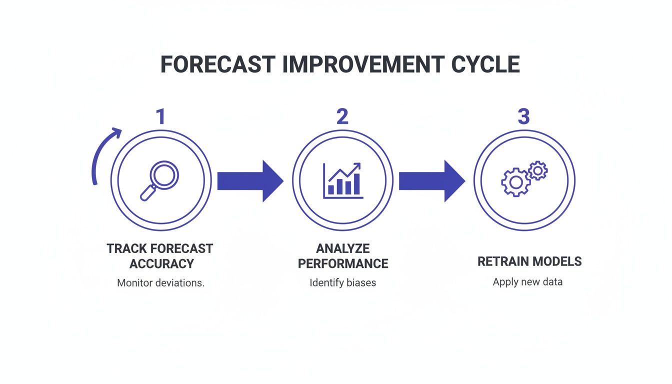 To improve, you must move beyond a reactive "fix-it-when-it-breaks" mindset. A forecast is never truly "done." The goal is to create a rhythm of tracking, analyzing, and retraining. This process catches performance decline before it becomes a problem and uncovers opportunities for improvement.