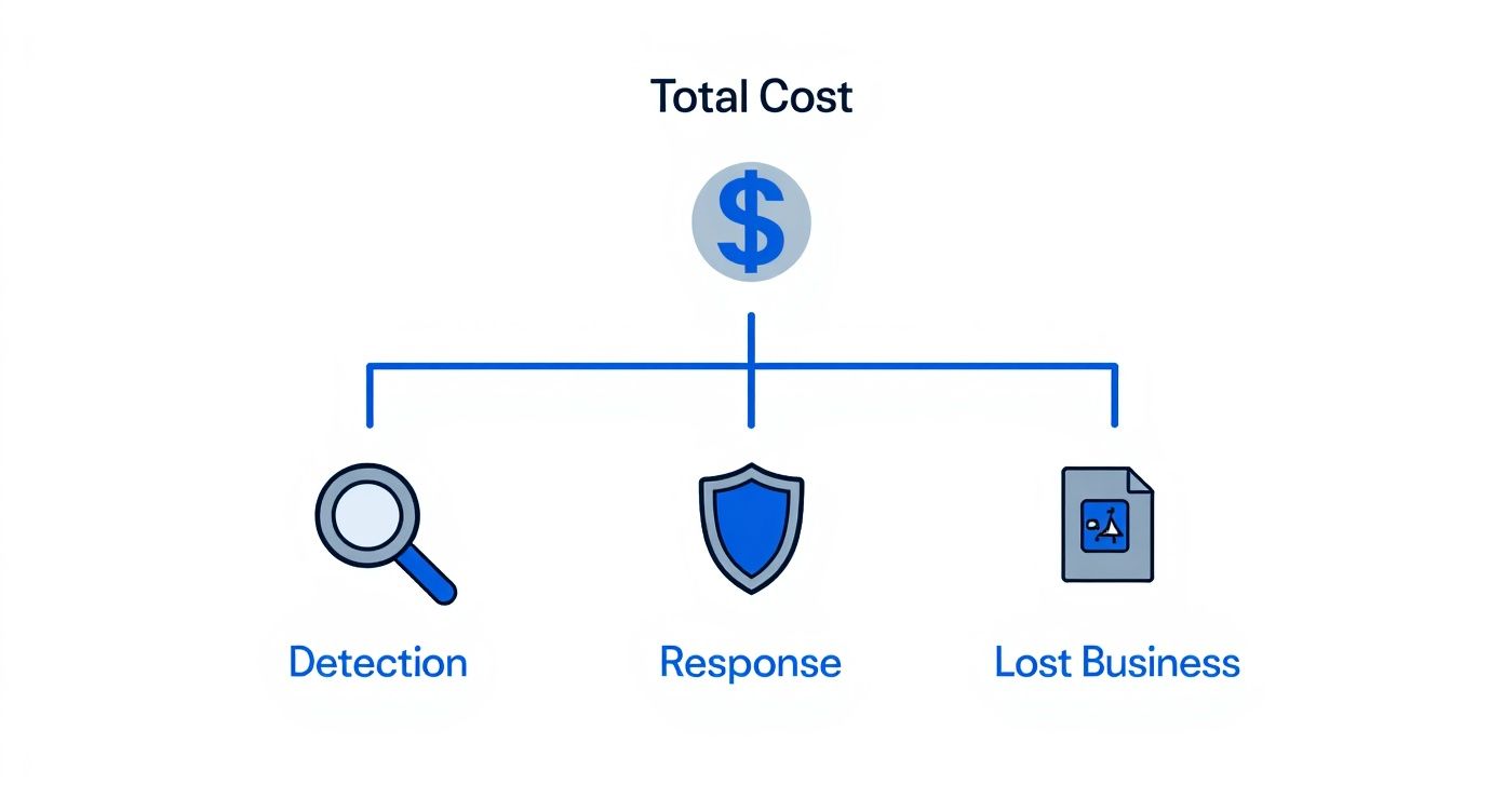 As the diagram shows, the immediate cleanup is just the beginning. The largest financial impact often comes from lost business—the slow, lingering damage that can cripple a company long after the breach is contained.